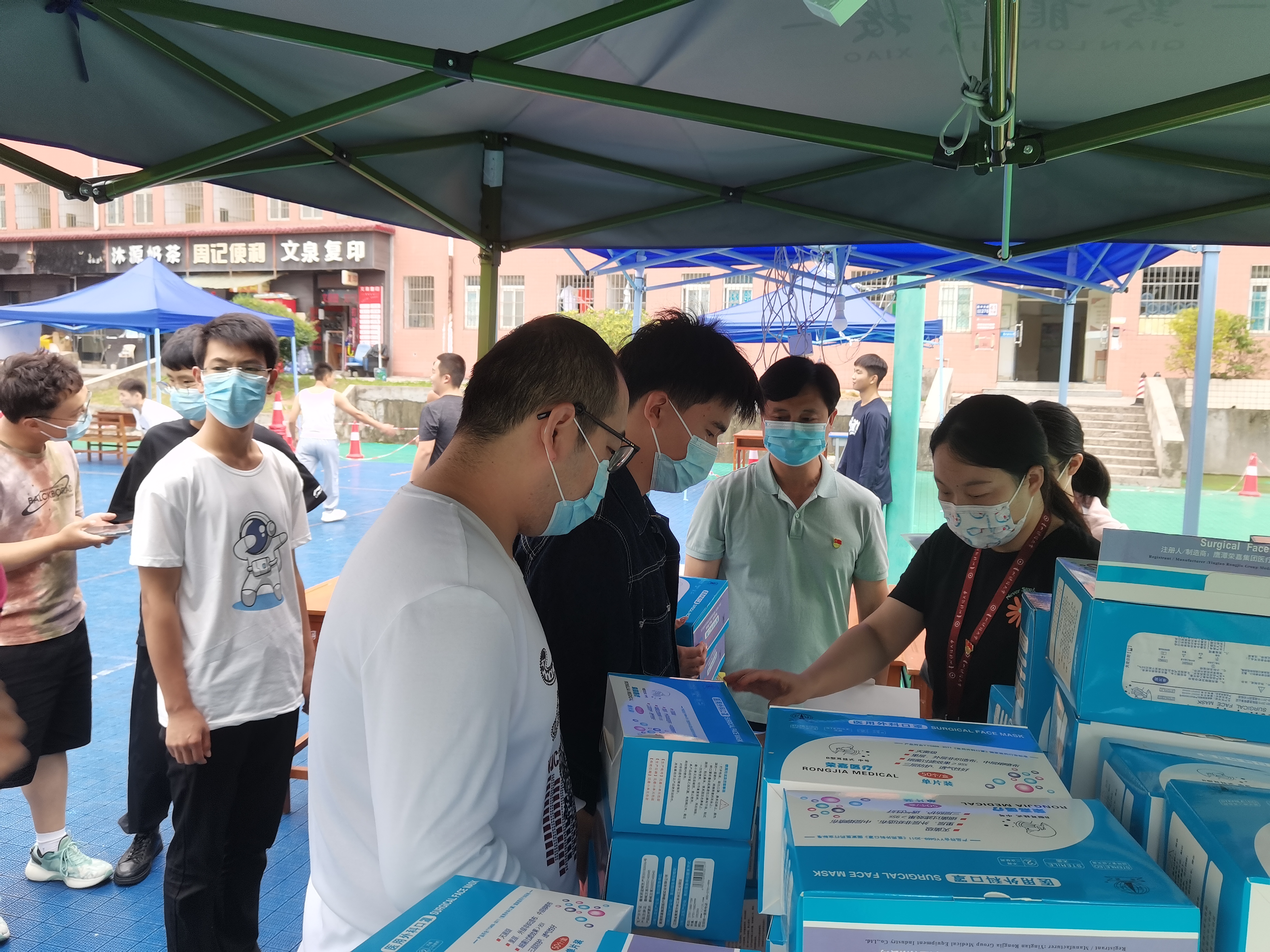 党委书记王治航、副书记肖启迪、副院长石莉组织志愿服务队在鹿冲关校区篮球场分班级为学生发口罩。