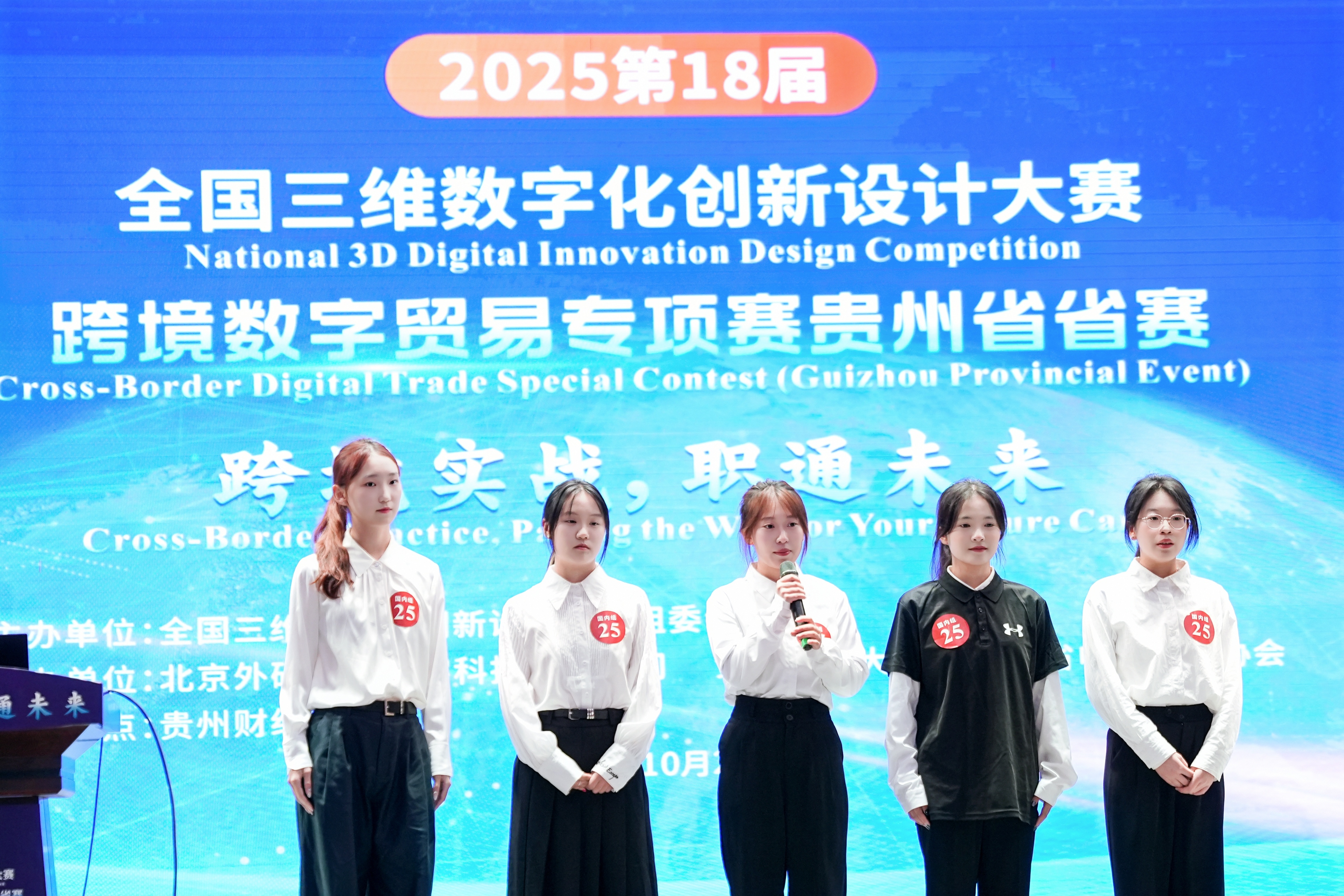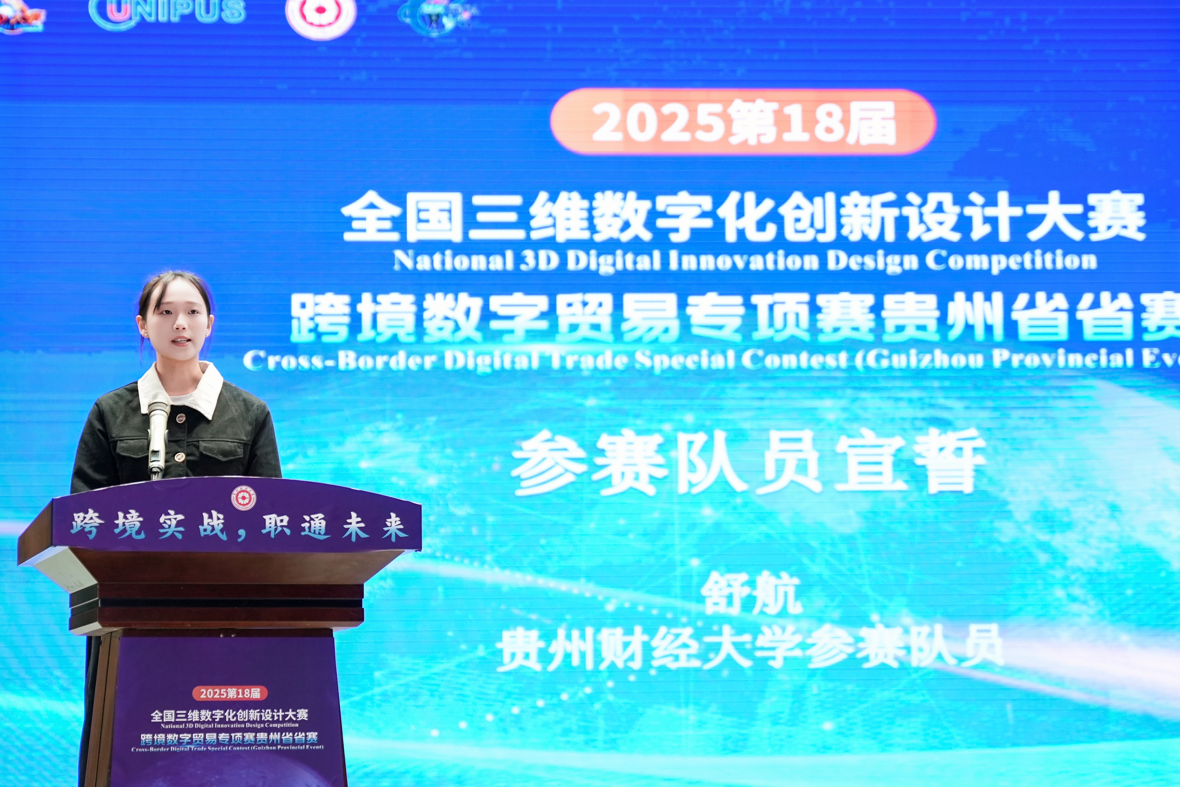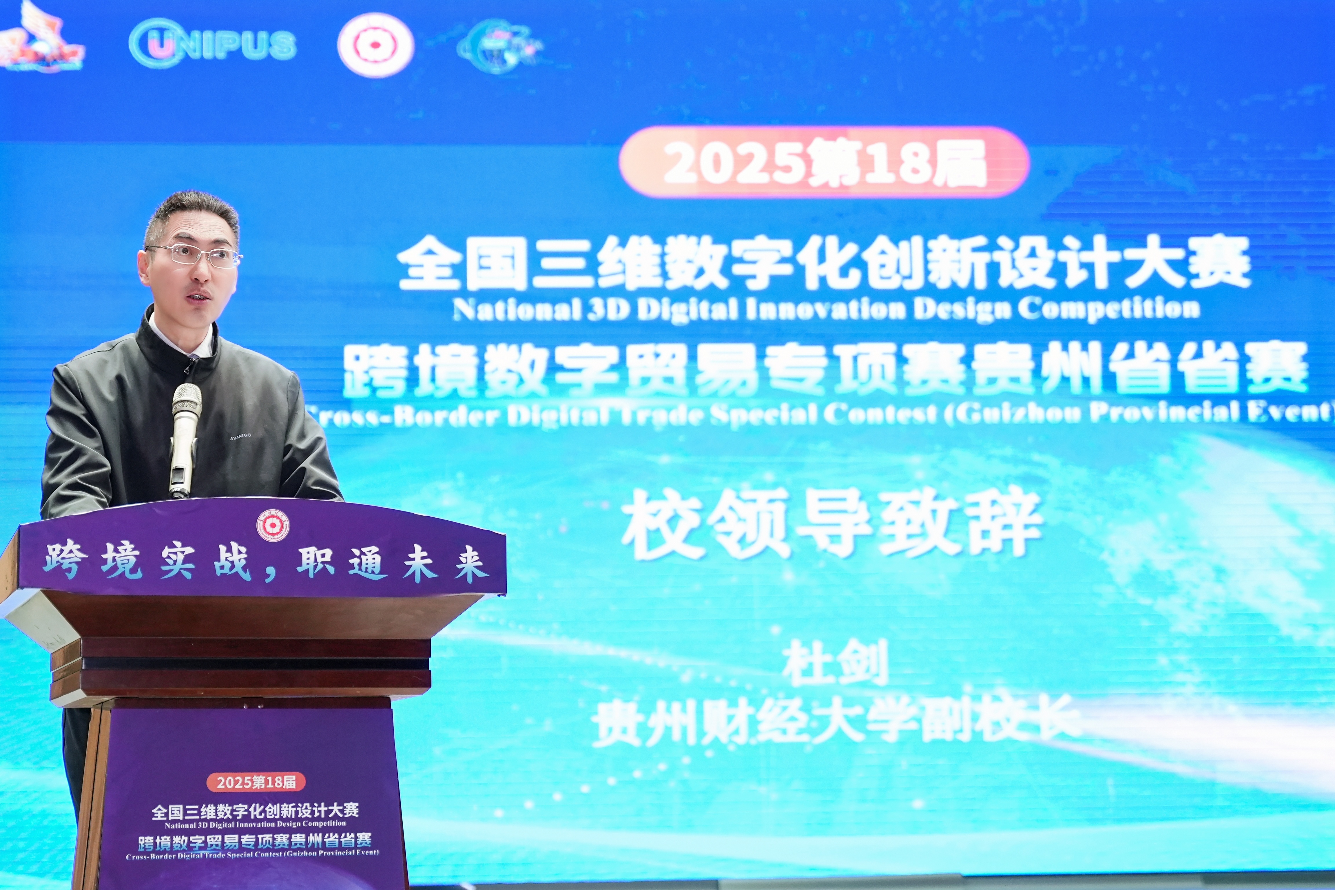 沙静 图文报道)10月25日,由贵州财经大学、北京外研在线数字科技有限公司、贵州省电子商务协会共同承办的,2025第18届全国三维数字化创新设计大赛(以下简称全国3D大赛)跨境数字贸易专项赛贵州省省赛在贵州财经大学学生活动中心举行。贵州财经大学副校长杜剑,对外经济贸易大学现代服务业研究中心首席教授陈进,组委会成员单位北京外研在线数字科技有限公司首席内容官兼职业教育事业部总经理徐一洁,全国三维数字化创新设计大赛组委会秘书处副主任姜宛辰,贵州电子商务职业Et足球直播