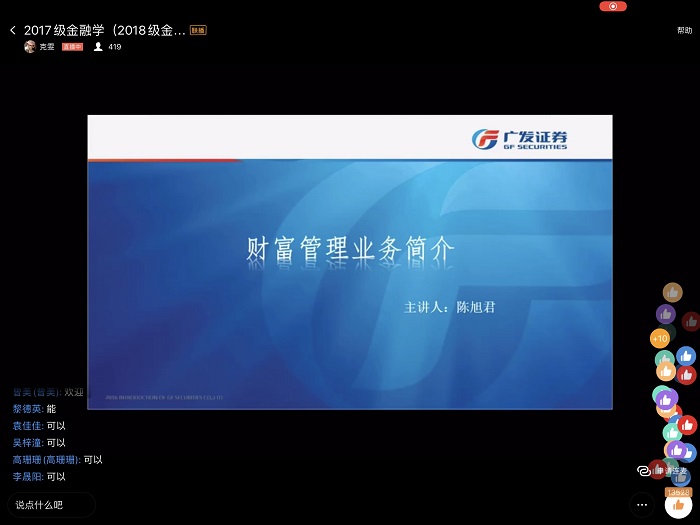 刘俊杰 图文报道) 7月14日上午十点,广发证券贵阳营业部财富管理部业务总监陈旭君,通过钉钉群直播的方式,以“财富管理业务”为题,为Et足球直播