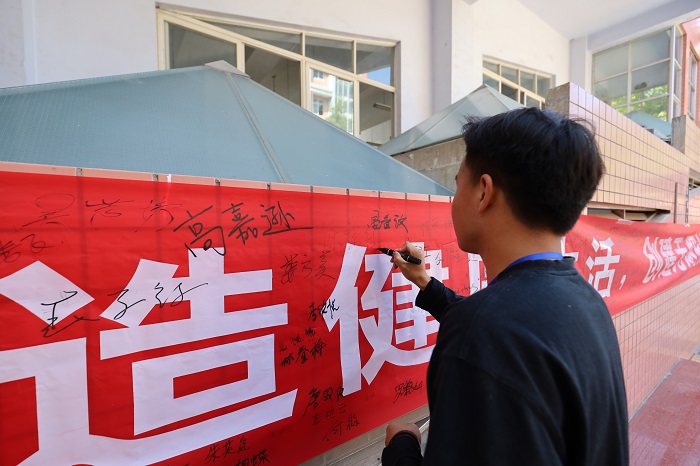 在学生部门的组织下,活动井然有序地进行。工作人员从吸烟对身体健康的危害、吸烟引发火灾的悲剧案例等内容对同学们进行宣讲,同学们进一步了解了有关公共场所禁烟的必要性、吸烟与肺部健康的关系、吸烟和被动吸烟对身体健康的严重危害等介绍,并郑重地在横幅上签下自己的名字,表达了拒绝吸烟,拒吸“二手烟”,共创没有吸烟危害的清新和谐校园的积极态度。