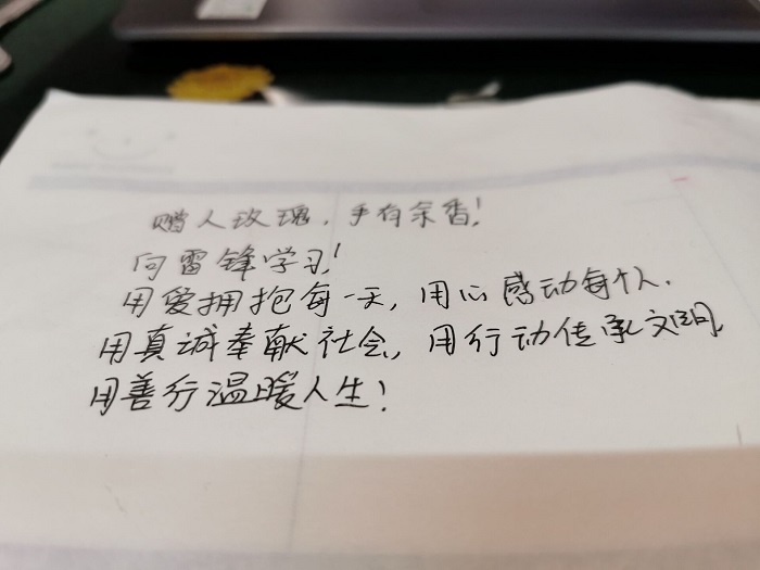 同学们以写下“爱心暖贵财”心愿贴、录制视频的方式来提倡学雷锋志愿服务精神