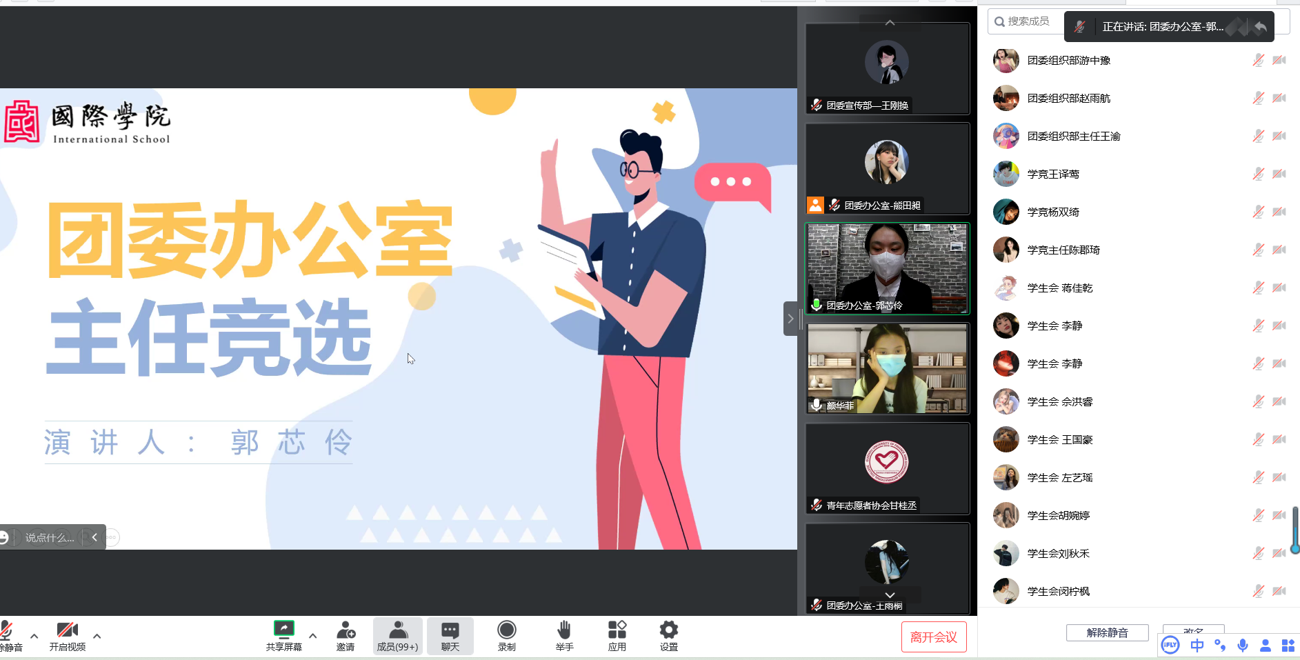 大会开始,颜华菲首先对上一届团委学生会的工作表示高度肯定,同时对新一届学生干部提出要求,希望新一届学生骨干要以身作则,严格要求自身,保持朝气蓬勃、奋发有为的精神状态,传播校园正能量,全心全意为广大学生服务。随后,34名团委学生干部候选人依次进行演讲,阐述了自己的竞选意向、工作理念和今后工作规划等。