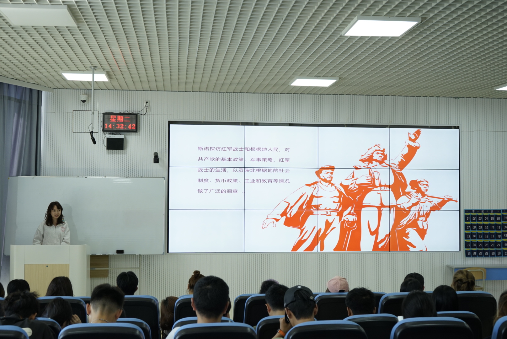 读书会上,同学们分享精心挑选的书籍,用书香礼赞新中国,感恩奋进新时代。《红星照耀中国》以其独特的视角,带领现场同学重温了中国共产党领导的革命斗争史,感受了革命先辈的英勇无畏与坚定信念;《乡土中国》则通过深入浅出的分析,揭示了中国农村社会结构的独特性与变迁轨迹,让同学们对传统文化的根脉有了更深刻的理解;《基层女性》一书则以其真实动人的故事,展现了当代基层女性自强不息、勇于担当的精神风貌,激励着每一位参与者;《中国由此改变》以宏大的叙事手法,描绘了改革开放以来中国发生的翻天覆地的变化,激发了在场同学们对国家未来的无限憧憬;经典诗词《虞美人》那悠扬的韵律、深情的文字,不仅是对古代文人墨客情怀的致敬,更是对新中国繁荣昌盛的深情礼赞。互动交流环节更是将现场气氛推向了高潮。同学们围绕书籍内容,结合个人感悟,畅所欲言,分享了自己的阅读体会与心路历程。
