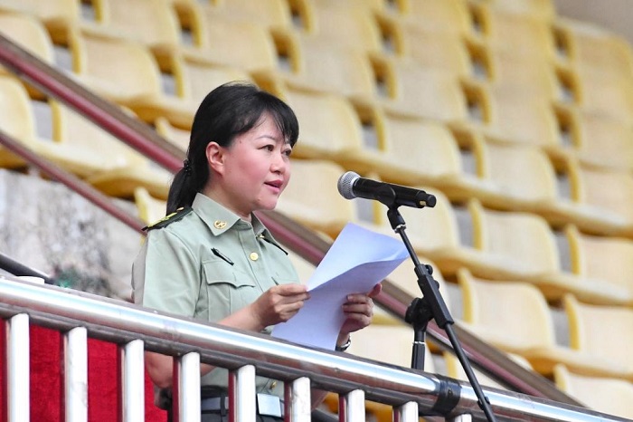 副校长、军训师师长肖小虹讲话,她对参训新生和跟训教师提出了四点要求:一是统一思想,步调一致;二是严格训练、严格要求;三是严守纪律,争当先进;四是互相尊重,服从律例。并希望2021年新生以高标准完成各项训练任务,继往开来,再创新绩!
