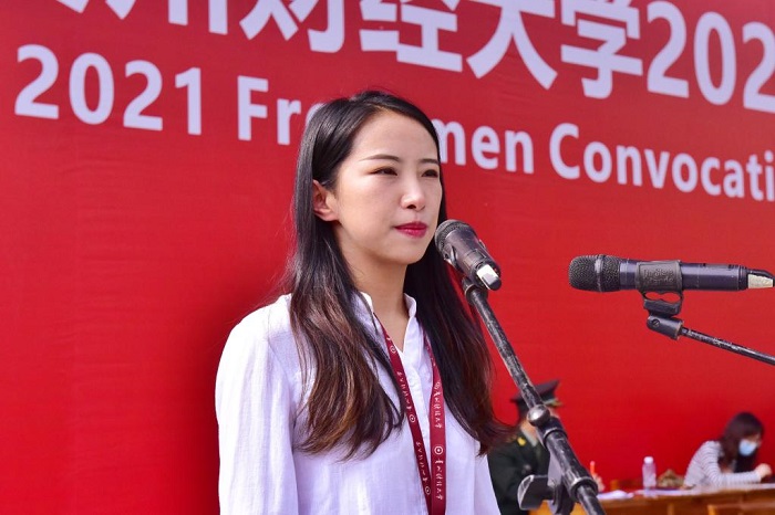 财务管理张旭同学作为新生代表发言,要做有担当的人,做知识渊博的人,知行合一,成为学以致用的儒魂商才。