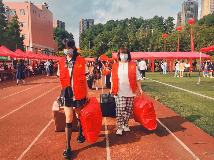 迎新现场,各部门老师和学生志愿者各司其职,全力为迎新保驾护航。根据学校疫情防控的要求,2021级新生经过体温检测、查验健康码行程码和录取通知书、行李消毒等程序后有序进入校园。志愿者热情地带领各位新生前往报道地点,讲解入学注意事项,介绍学校环境。