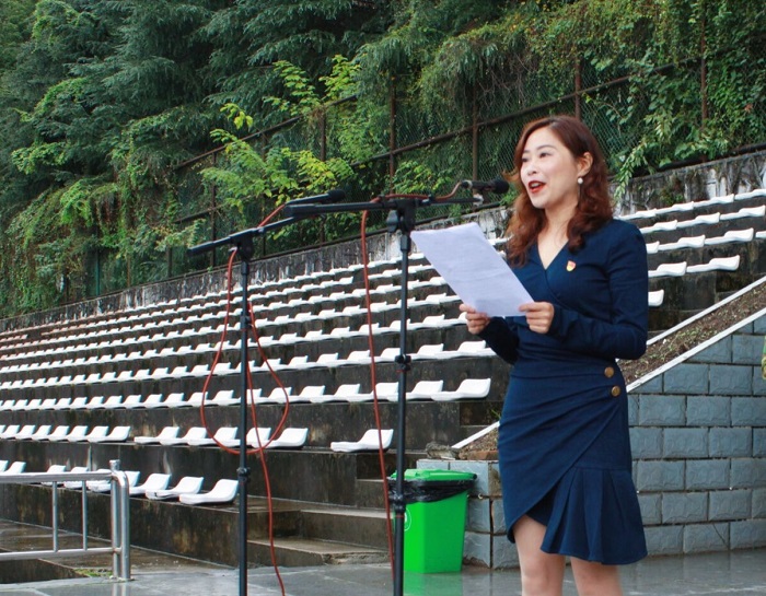 李永兰老师发言,她代表全体老师对新同学们表示热烈的欢迎,并寄语新生“做好规划,人生由我”。