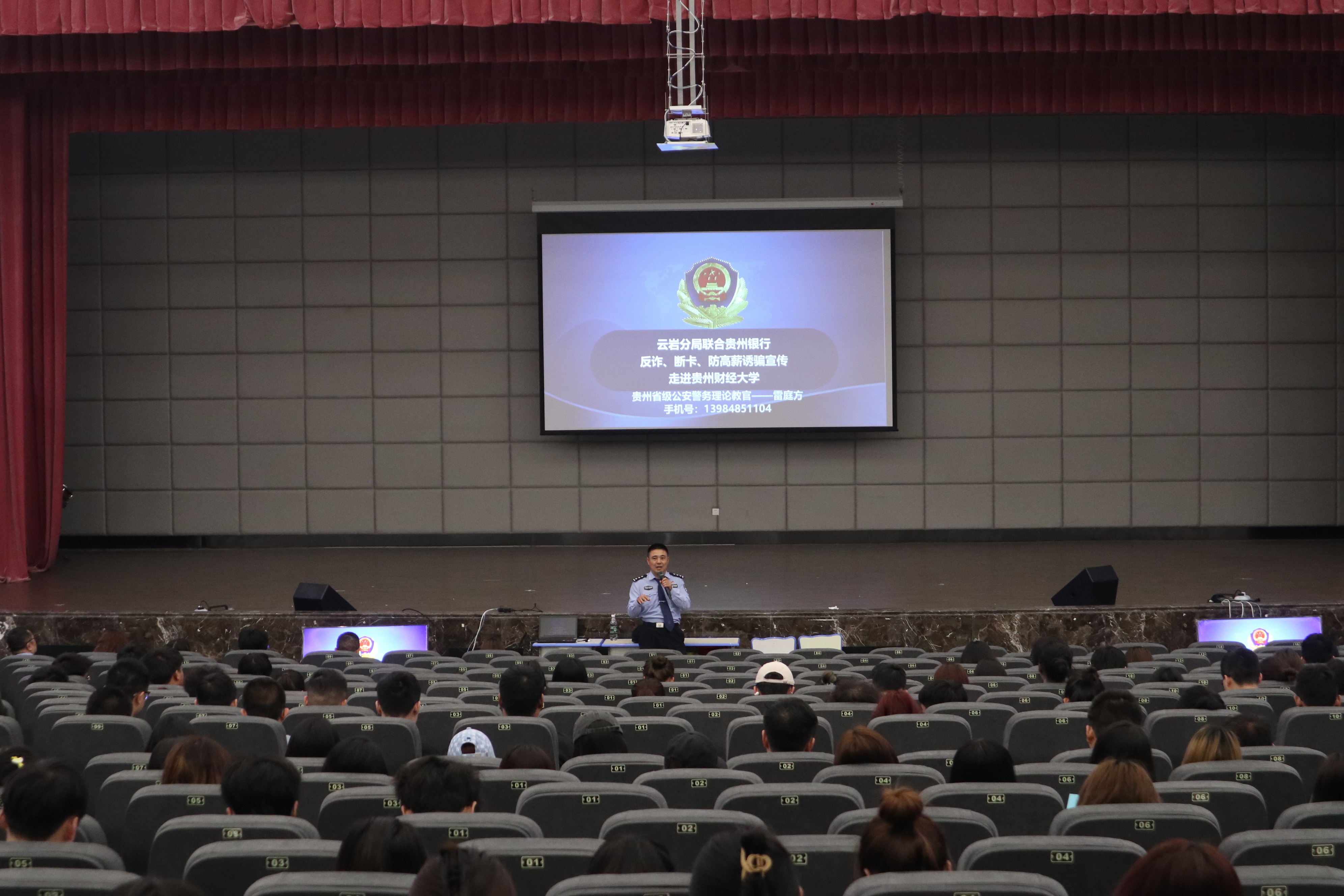 联合宅吉派出所和贵州银行开展“反诈 断卡 防高薪诱骗”专题讲座,贵州省级公安理论教官雷庭方担任讲座主讲人。