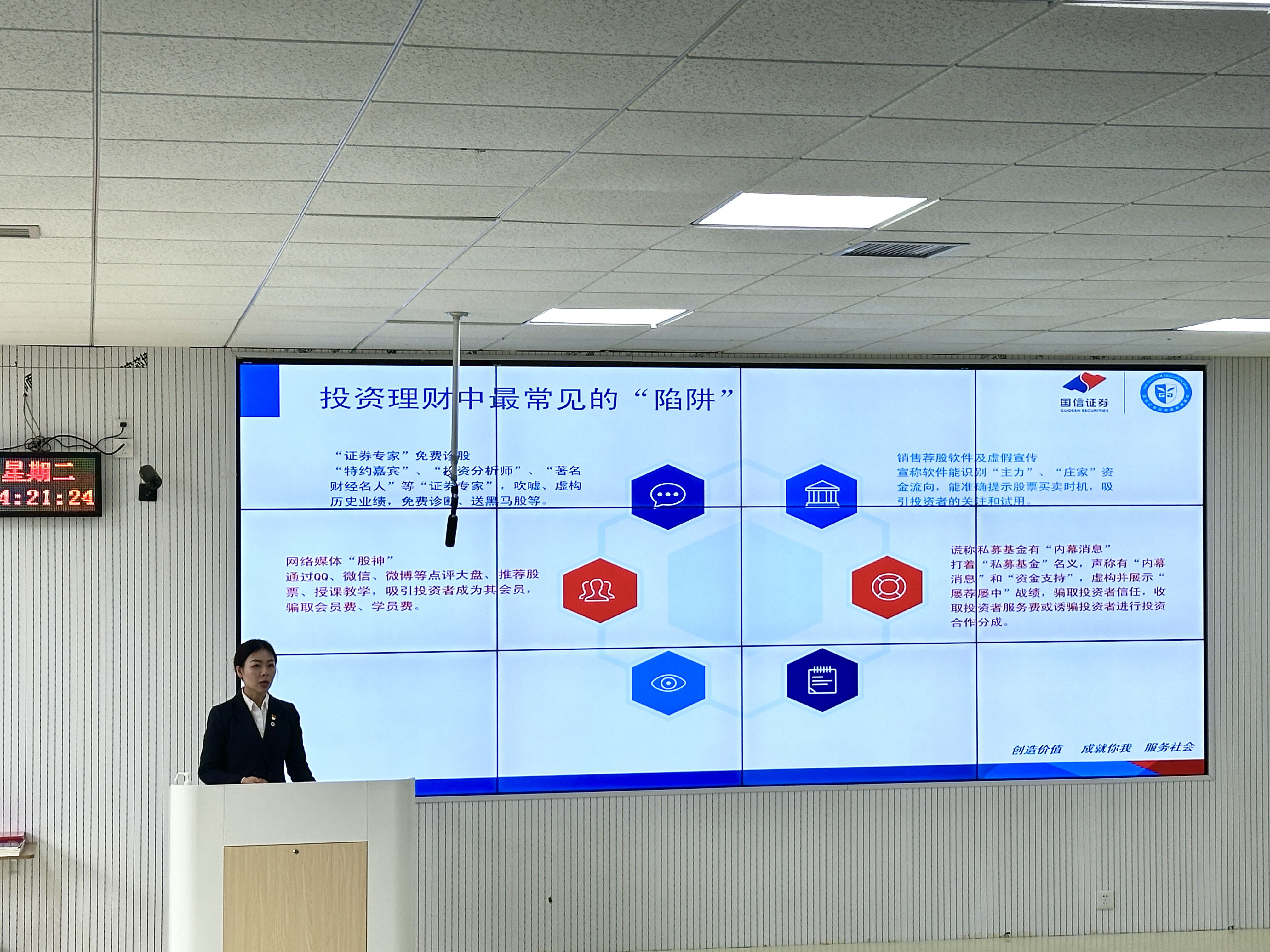 邀请国信证券吴智玲老师,在西区乐学楼102教室举办“金融知识进校园——防范非法证券宣传教育”讲座。