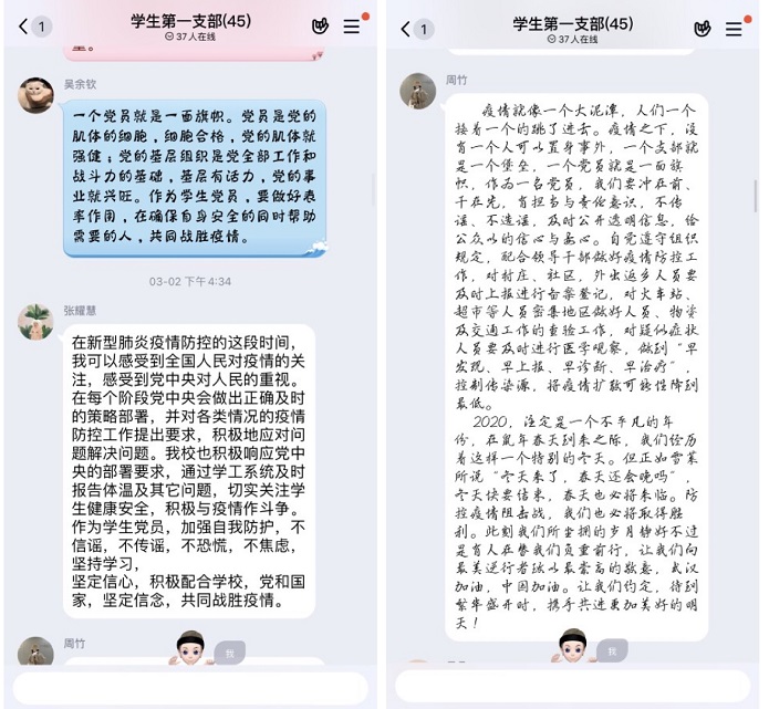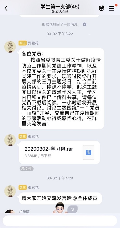 (Et足球直播 郑君花 图文报道)为加强支部教师及学生党员在特殊事情对党理论知识的学习和对疫情局势的把控,Et足球直播 学生第一党支部于3月2日召开第一次网络支部大会,支部党员应到45人,有两位海外党员因时差关系,故实到43人。