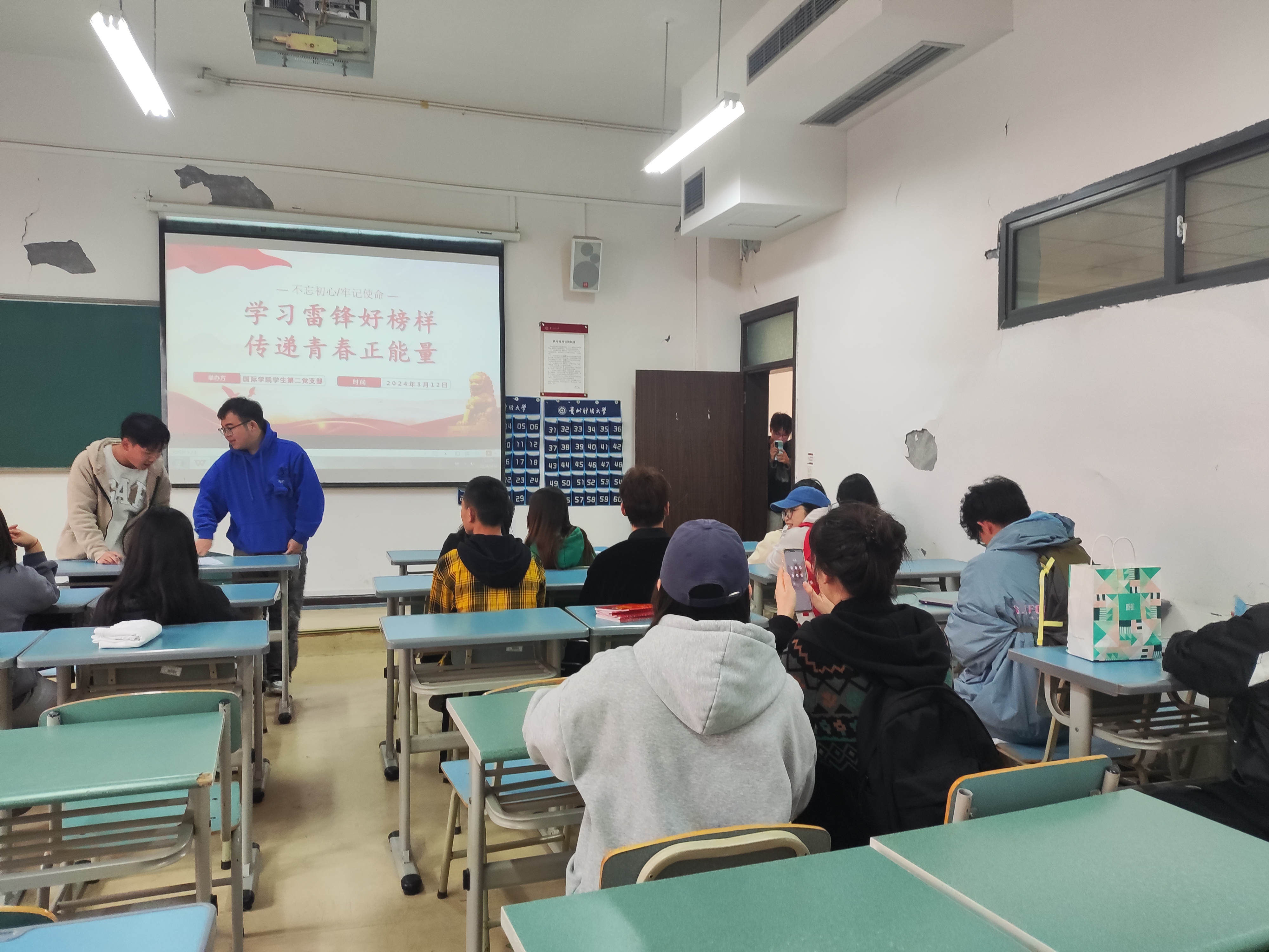 学生第二党支部在博学楼2-14教室开展“学习雷锋好榜样,传递青春正能量”主题党日活动。