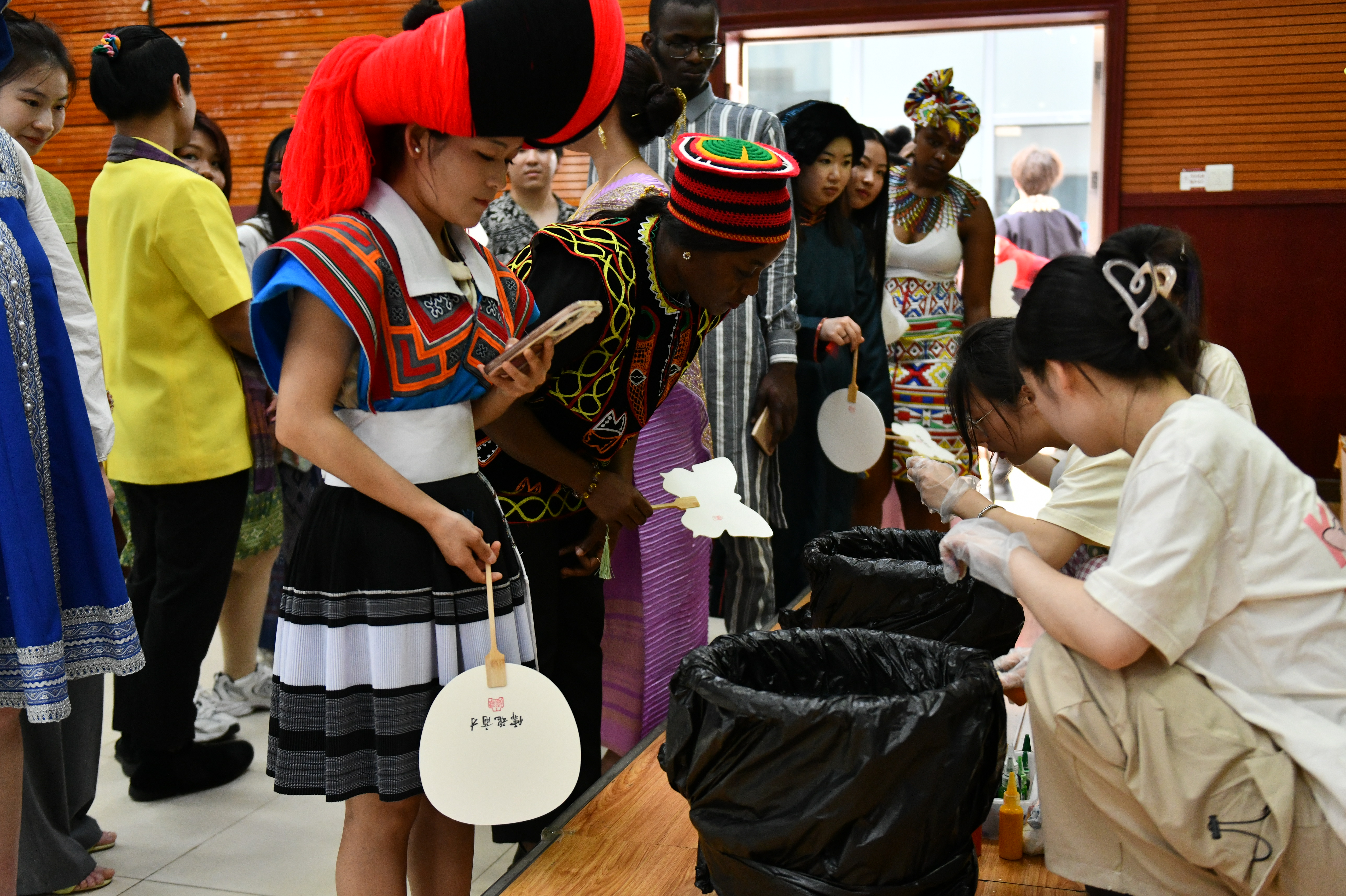 教师的指导下,中外学生们在活动现场一同亲手制作漆扇并展示,不仅学习了漆扇的制作技艺,还深刻感受到了非遗文化的深厚底蕴。活动现场气氛热烈,掌声不断,让中外师生更加感受和直观地了解各国的文化。