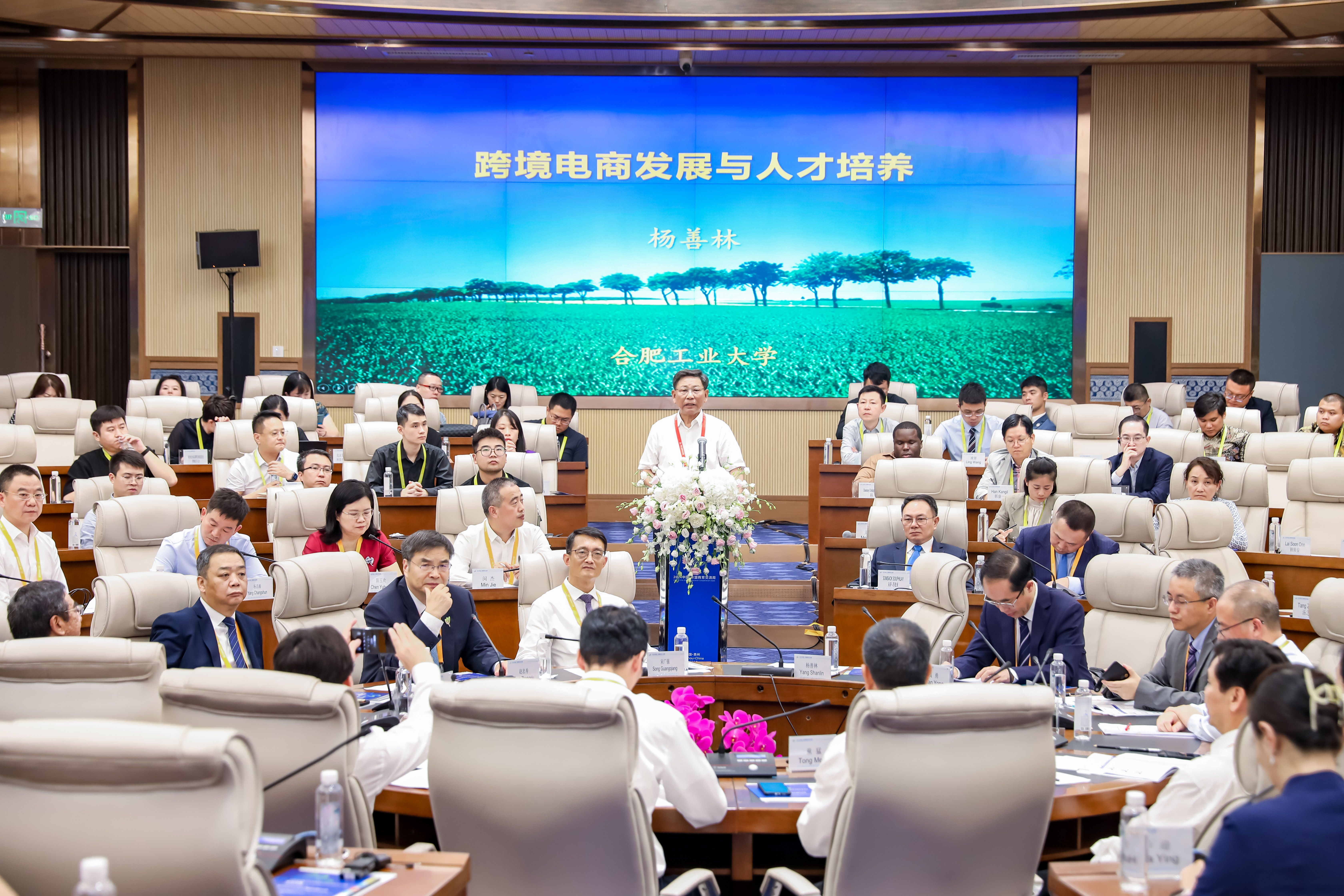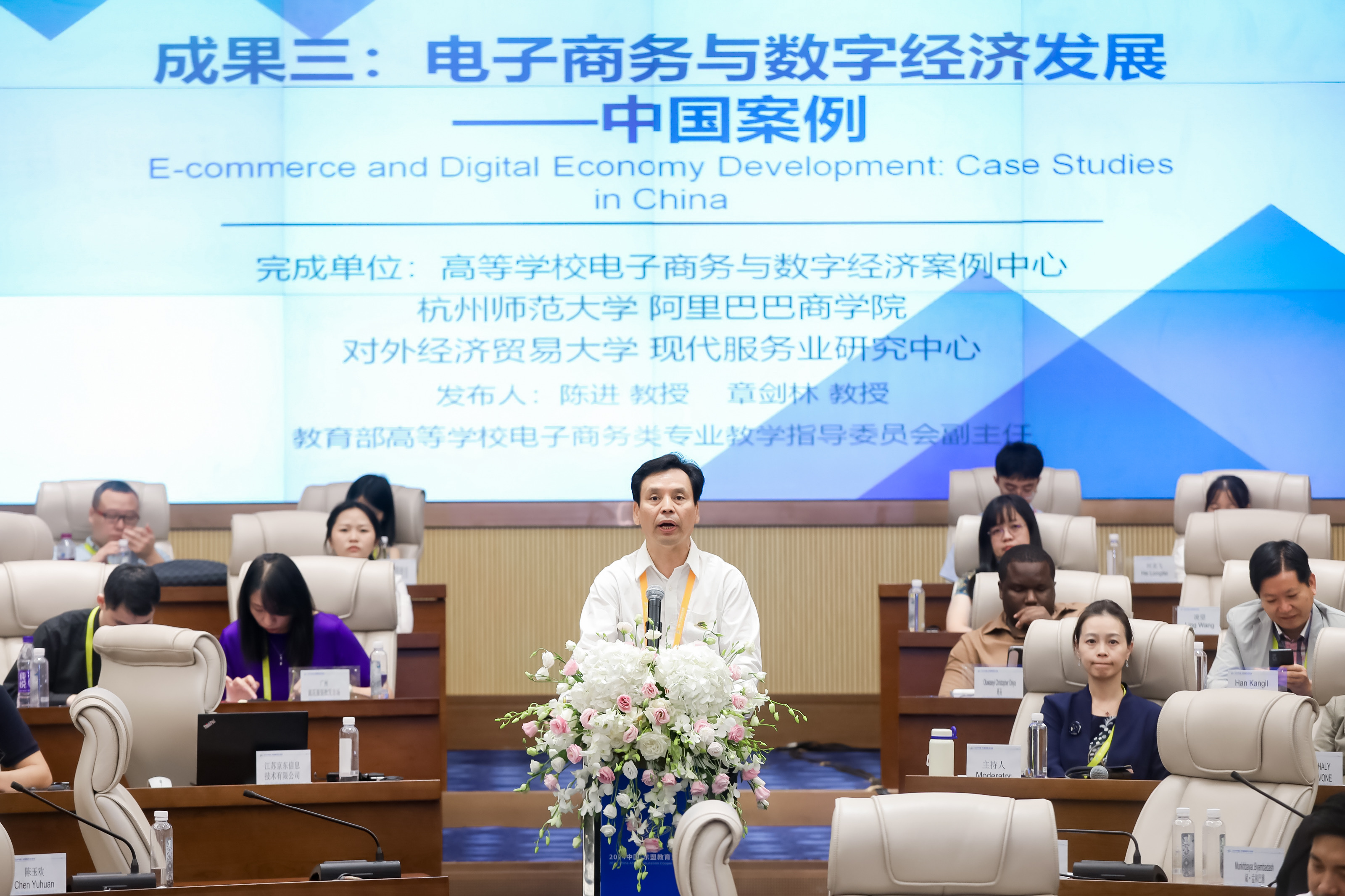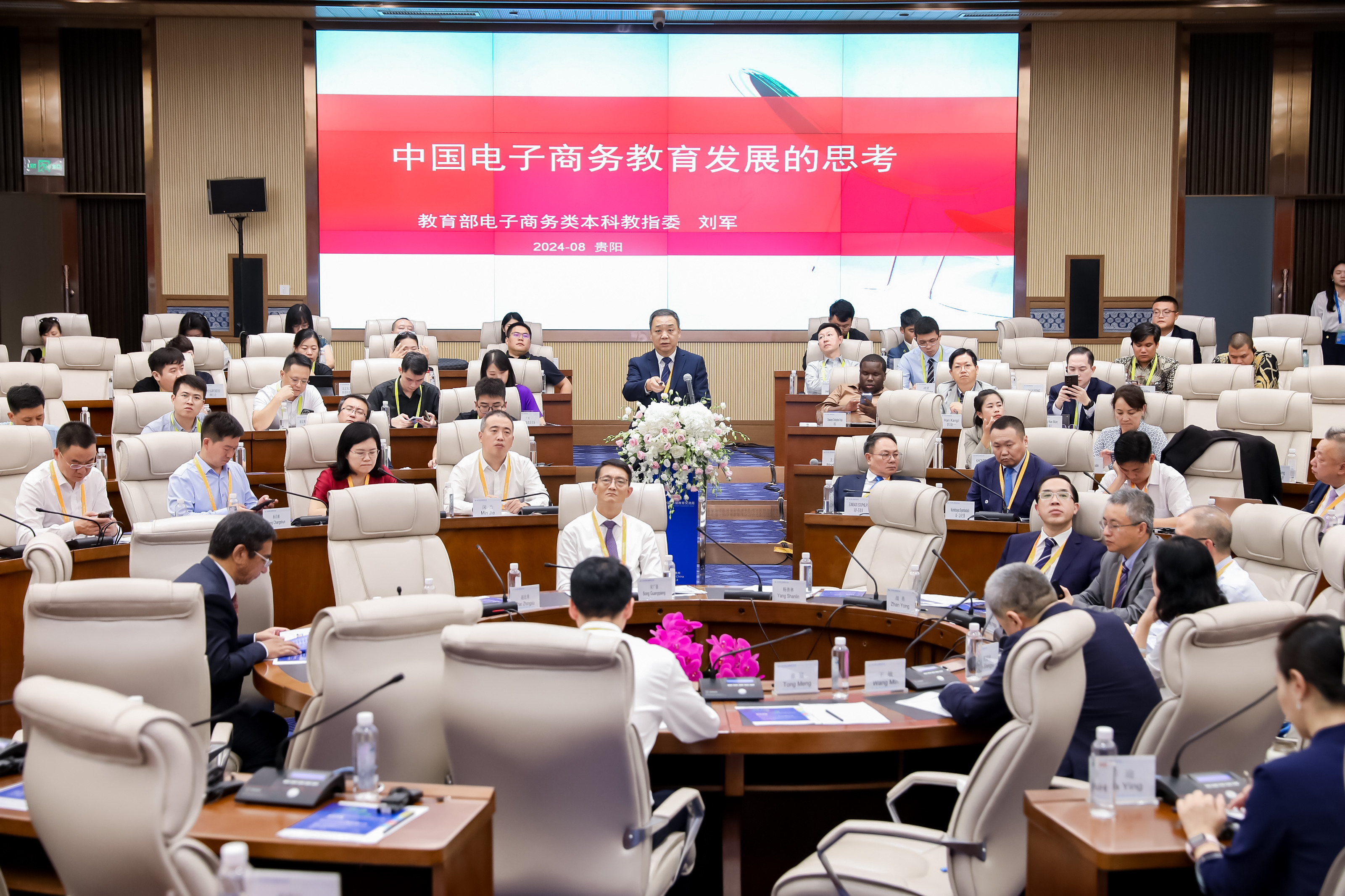 开幕式后举行了主题发言,由贵州财经大学党委书记战勇主持。中国工程院院士杨善林、对外经济贸易大学校长赵忠秀、北方工业大学党委书记、教育部高等学校电子商务类专业教学指导委员会主任刘军、浙江工商大学校长王永贵、西南财经大学校长李永强、山东财经大学校长洪俊杰、贵州财经大学校长缪坤和分别作了题为《跨境电商发展与人才培养》、《协同共建,推动全球电商教育事业高质量发展》、《中国电子商务教育发展的思考》、《面向新质生产力的新型电子商务人才培养模式创新与实践》、《携手共创适应全球商业格局变革趋势的高等财经教育》、《适应新质生产力发展要求 培养高质量电商人才》、《探索电商教育新模式开创人才培养新时代 奋力谱写中国式现代化贵州实践新篇章》的报告。